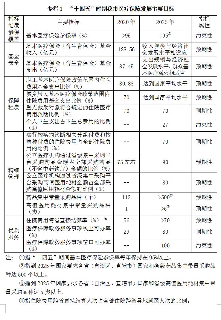到2025年,医疗保障制度更加成熟定型,基本完成待遇保障、筹资运行、医保支付、基金监管等重要机制和医药服务供给、医保管理服务等关键领域的改革任务,落实基本医保省级统筹,医疗保障政策规范化、管理精细化、服务便捷化、改革协同化程度明显提升,医疗保障事业高质量发展,实现更好保障病有所医的目标。
