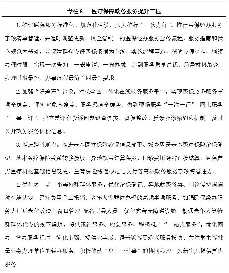提升医保经办管理服务水平。坚持传统服务与智能化服务创新并行,落实政务服务事项网上办理,畅通医保咨询服务渠道。落实高频医疗保障服务事项“跨省通办”和政务服务“好差评”制度。完善医保经办服务基础化建设,提升服务特殊群体能力,健全服务手段,帮办代办,加强老年人等特殊群体服务引导。