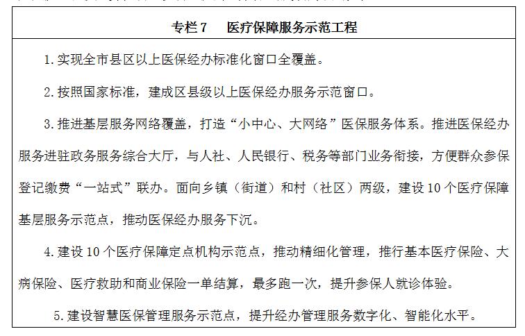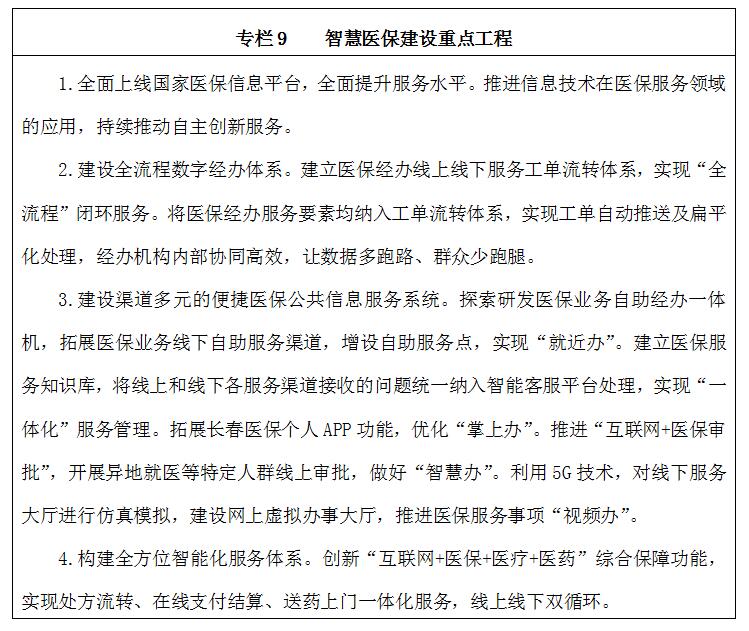 ——建设智慧医保。全面应用国家医疗保障信息平台,加快推进医保公共服务数字化转型,“互联网+”医保服务更加智能,推进数据共享,医保电子凭证普遍推广,就医结算更加便捷高效。