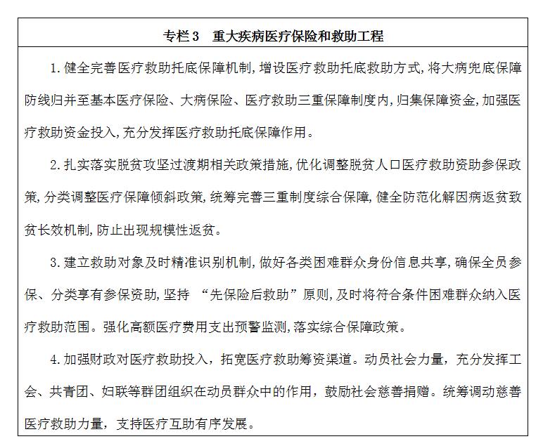 加快建立健全有效减轻困难群众重特大疾病医疗费用负担、有效防范和化解因病致贫返贫的长效机制。强化基本医保、大病保险、医疗救助三重制度综合保障能力,坚持应保尽保、保障基本,尽力而为、量力而行,实事求是确定困难群众医疗保障待遇标准,确保困难群众基本医疗有保障,不因罹患重特大疾病影响基本生活,同时避免过度保障。有效衔接乡村振兴战略,逐步实现由集中资源支持脱贫攻坚向三重制度常态化保障平稳过渡。加强医疗救助和临时救助、应急救助、慈善救助等社会救助政策协同,筑牢民生托底保障防线。
