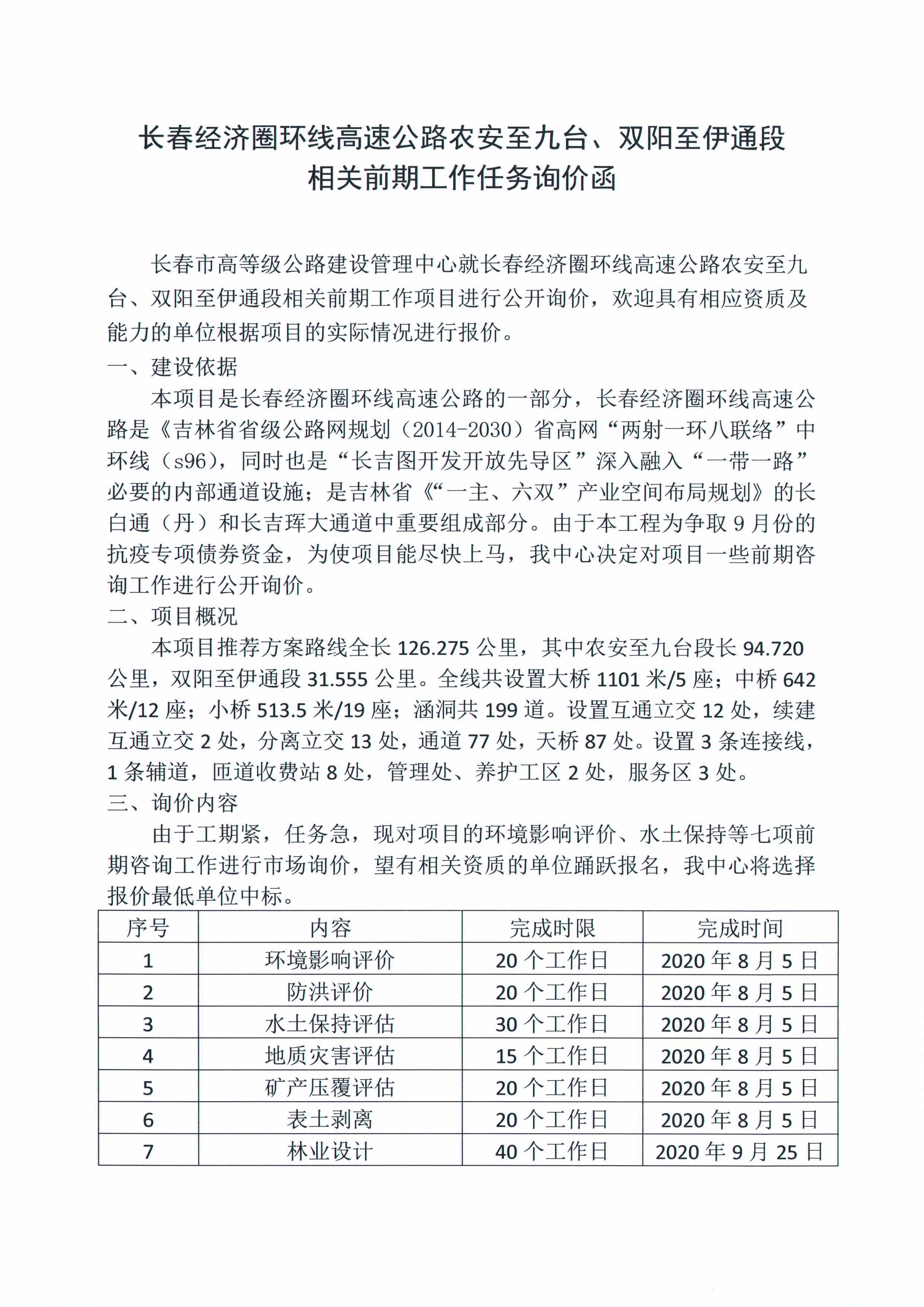 长春经济圈环线高速公路农安至九台、双阳至伊通段相关前期工作任务询价函