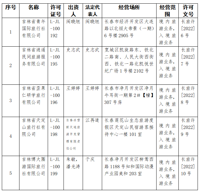 1.旅行社设立:以下5家旅行社已办理《旅行社业务经营许可证》。