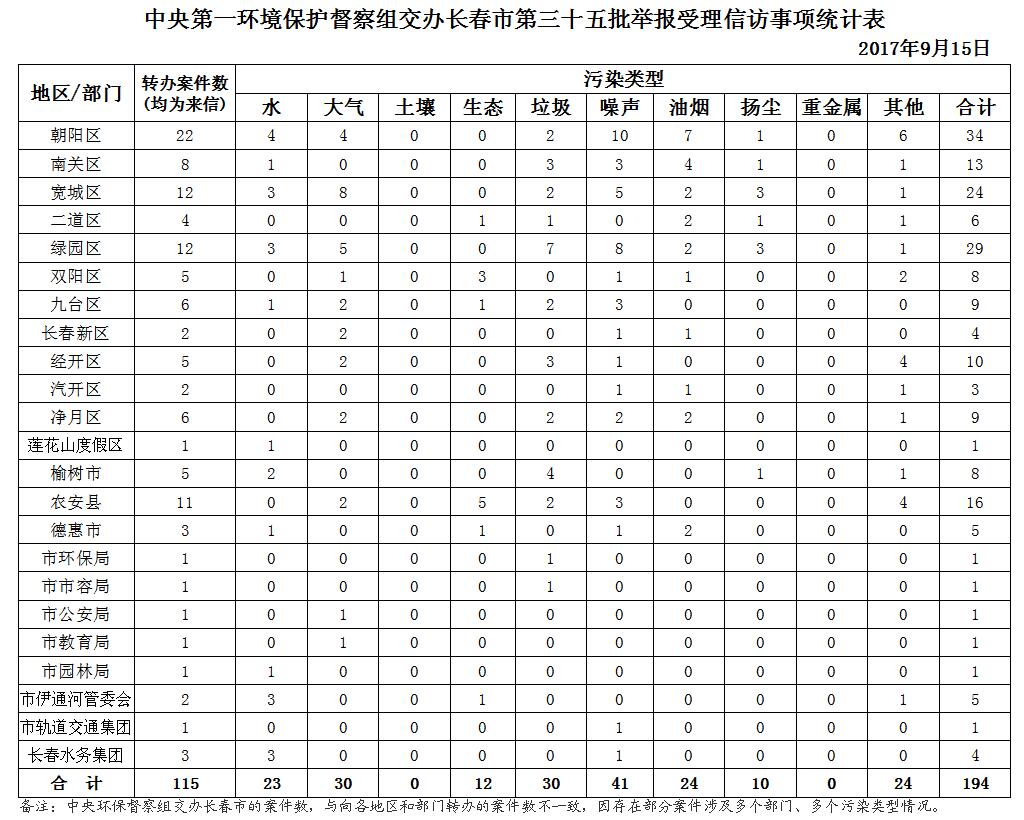9月15日,中央第一环境保护督察组向365bet手机网址多少_365bet注册送36_365bet足球联赛交办了第三十五批举报受理信访事项110件(重点案件10件),共涉及194个环境问题。其中涉水问题23个,大气问题30个,生态问题12个,垃圾问题30个,噪声问题41个,油烟问题24个,扬尘问题10个,其他问题24个。共涉及15个县(市)区、开发区和6个市直部门,其中朝阳区22件, 南关区8件,宽城区12件,二道区4件,绿园区12件,双阳区5件,九台区6件,长春新区2件,经开区5件,汽开区2件,净月区6件,莲花山度假区1件,榆树市5件,农安县11件,德惠市3件,市环保局1件,市市容环卫局1件,市公安局1件,市教育局1件,市园林局1件,市伊通河管委会2件,市轨道交通集团1件,长春水务集团3件。
