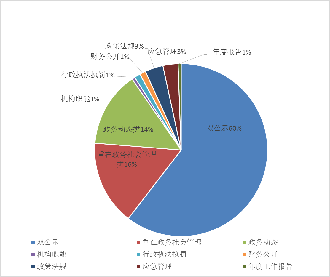2018年,主动公开信息177件。其中:双公示类107件,占60%,重大政务及社会管理类28件,占16%;政务动态类25件,占14%;机构职能类1件,占1%;行政执法执罚类2件,占1%;财政公开类2件,占1%;政策法规类6件,占3%;应急管理类5件,占3%;年度政府信息公开报告类1件, 占1%。